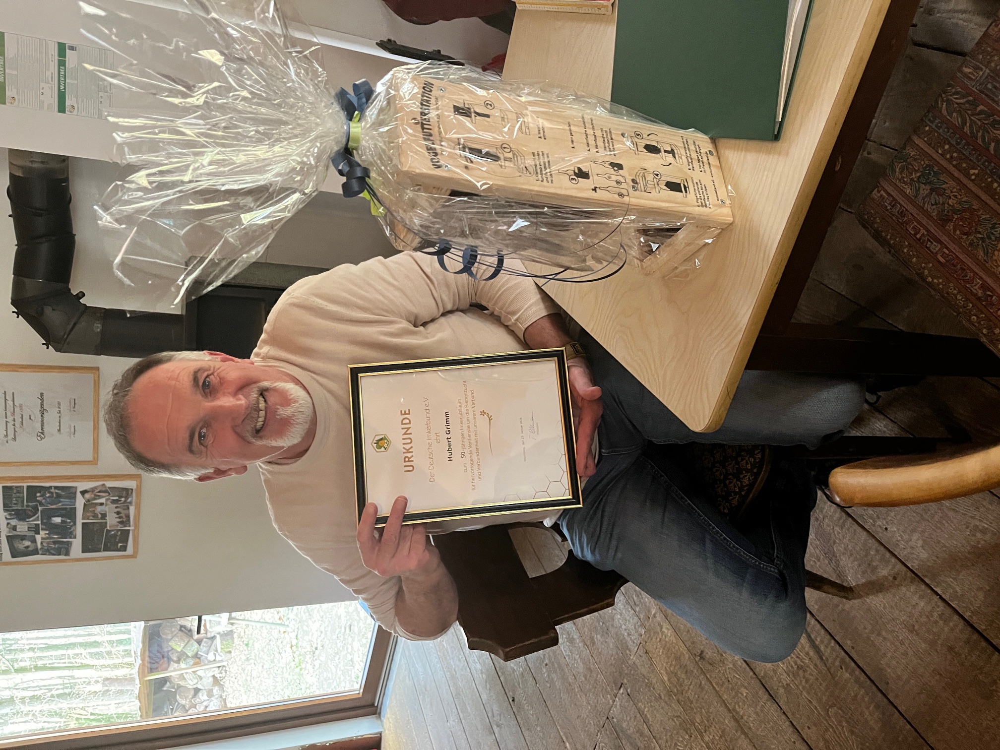 Hubert (der Erste) Grimm wurde in der Mitgliederversammlung für fünfzig Jahre Bienenzuchtverein Kohlbachtal geehrt. Er hat als 15-Jähriger mit der Imkerei angefangen und ist bis heute dabeigeblieben. Sonntags hat er, noch im alten Bienenhaus, die Stammtische betreut und zeitweise als zweiter Vorstand fungiert. In den ersten Jahren der Neuimkerschulungen hat er die praktischen Handgriffe vorgeführt, immer ohne Schleier und mit der Pfeife im Mund. Zu dieser Zeit hat er sich um die Vereinsvölker gekümmert, da gab es für die Neuimker noch Honig zum Einstieg. Seit er nun den Schwarm seines Lebens kennengelernt hat, wohnt er leider etwas weiter vom Vereinsgelände entfernt und kann nicht mehr so regelmäßig erscheinen. Wir hoffen aber, dass er weiterhin dem Verein verbunden bleibt, so ist er doch einer der letzten Dinosaurier des Vereins, die von den alten Geschichten erzählen können.