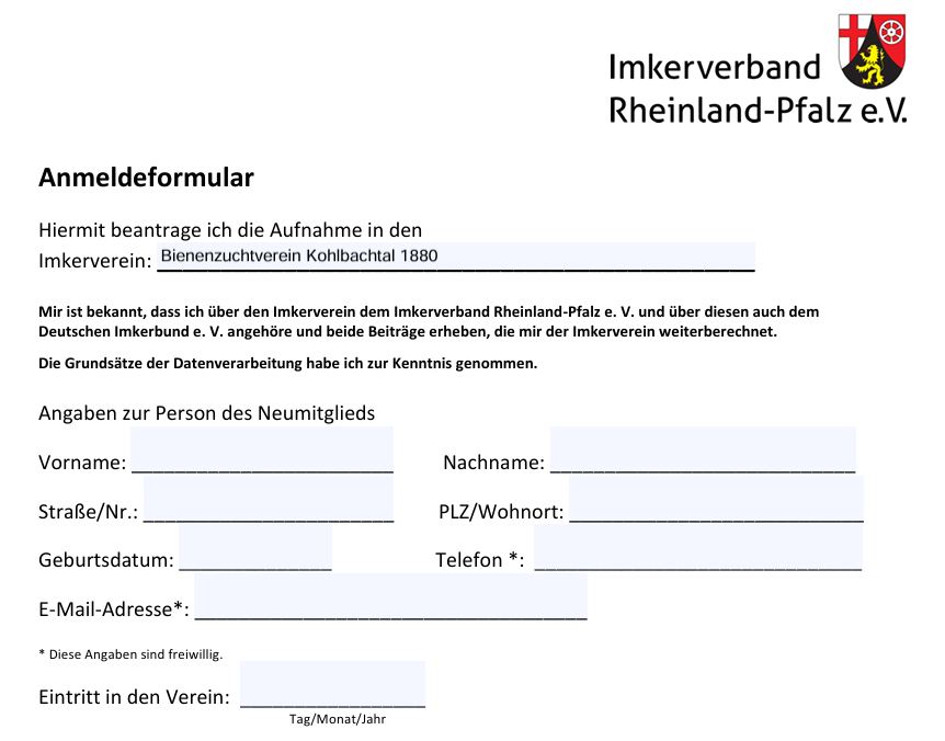 1. Zu Beginn der Imkerschulung ist es noch nicht zwingend erforderlich unserem Verein beizutreten. Die Schulungen sind prinzipiell über den Imkerverband RLP versichert. Aber, spätestens wenn man seine ersten Bienen erhält (z.B. Ableger), sollte man sich anmelden um den umfassenden Versicherungsschutz in Anspruch zu nehmen. Der Jahresbeitrag mit einem Bienenvolk beträgt ab 2023 etwa 63,-€.